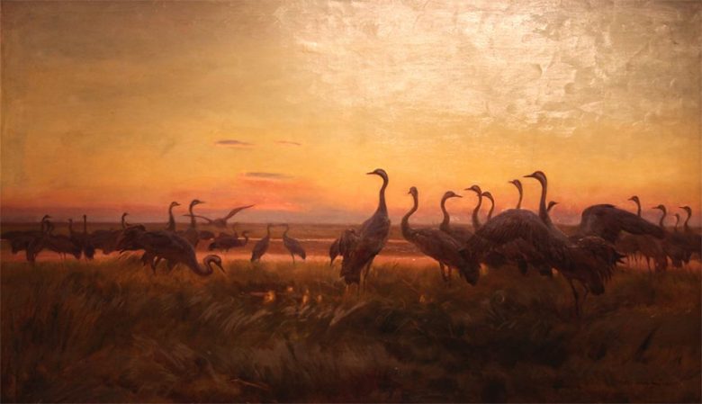 ilustr. Józef Chełmoński ” Powitanie słońca – Żurawie” 1910, olej, płótno, wymiary: 105 cm x 176 cm. Muzeum Sztuki w Łodzi – Pałac Herbsta.