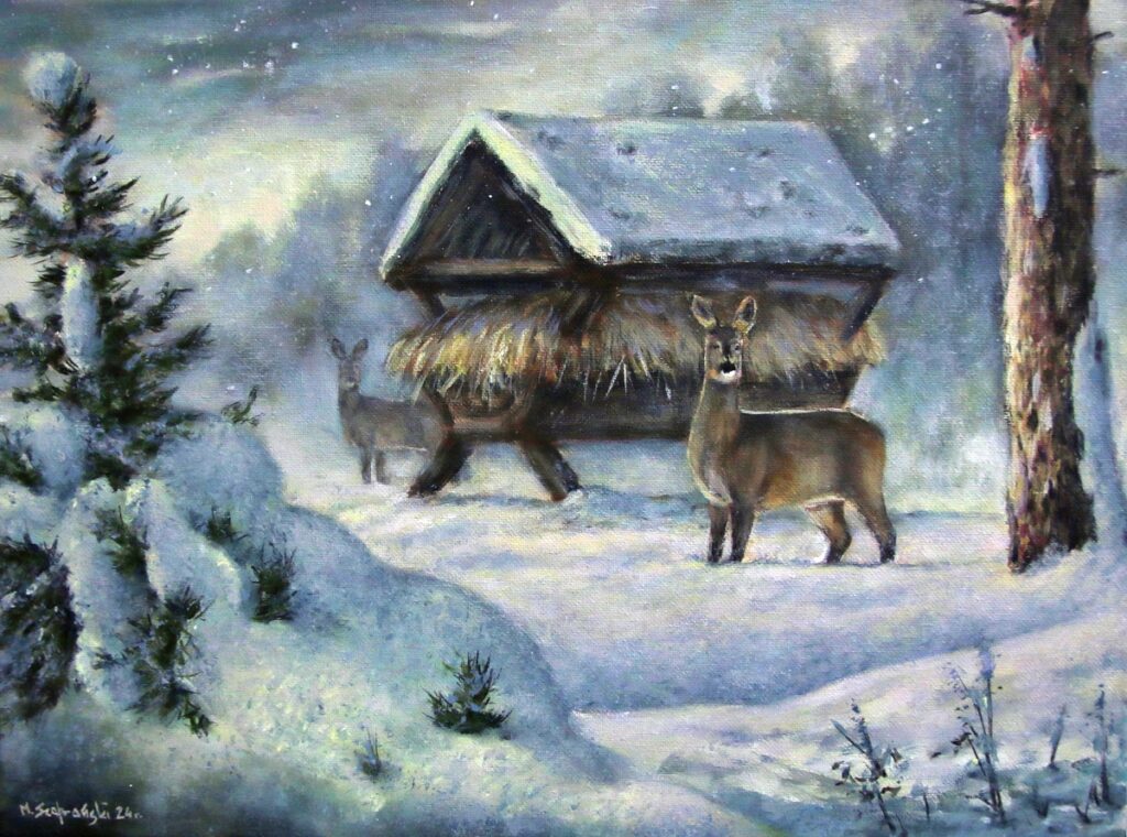 Ilustr. Marek Szafrański „Sarny przy paśniku”.Akryl Royal Talens Rembrandt na płótnie 40×30 cm.Styczeń 2024.