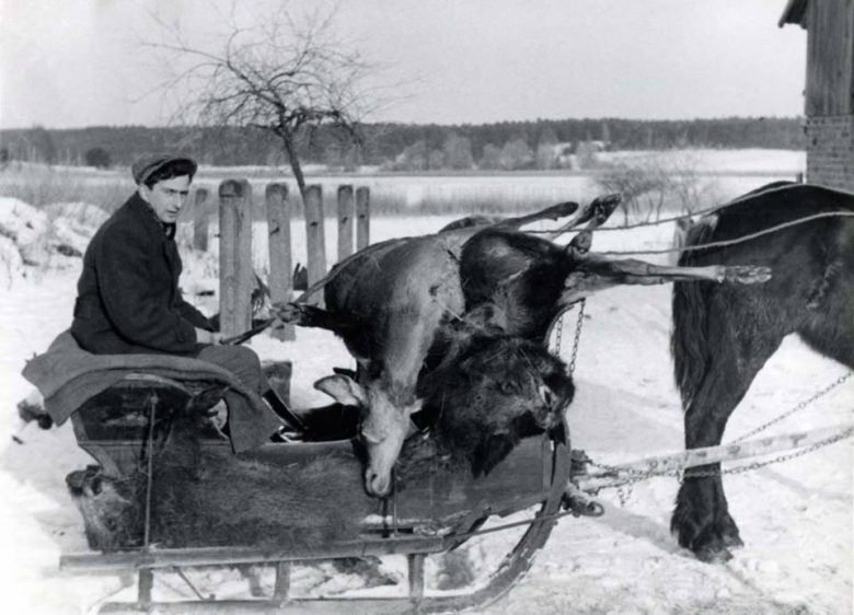 „Dookoła stał niski stół w kształcie podkowy, zbity ze świeżych desek, a przy nim ławy z cienkich pni brzozowych. Służba domowa kręciła się koło kotłów i wyciągała z koszy cynowe talerze, kieliszki i sztućce. […] Myśliwi zasiedli na ławach, a my roznosiłyśmy kieliszki z nalewką i podawałyśmy bułki z szynką i pasztetem. […] Potem rozdano …